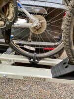 During testing, the StageTwo performed exceptionally well, maintaining stability and security while transporting bikes over various terrains. We tested it out on the highways, logging roads and through small mountain towns. The design effectively minimizes bike movement, ensuring that both bikes remain secure throughout the journey. Loading and unloading bikes is another highlight, thanks to the ratcheting arms that hold the front wheels securely in place.