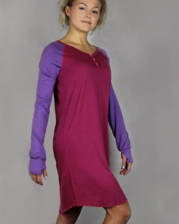 It’s a three-button Henley style with raglan sleeves, and you get flatlock stitching for a nice finished touch, and a shirttail hemline, which, as I mentioned, looks really cute while wearing around the house. The cuffs have thumb holes, which is a nice bonus. It’s 100 percent Merino wool, so they do suggest washing in cold water and air drying, but I’ve put my nightshirt in the drier on a cool setting and haven’t had a problem.